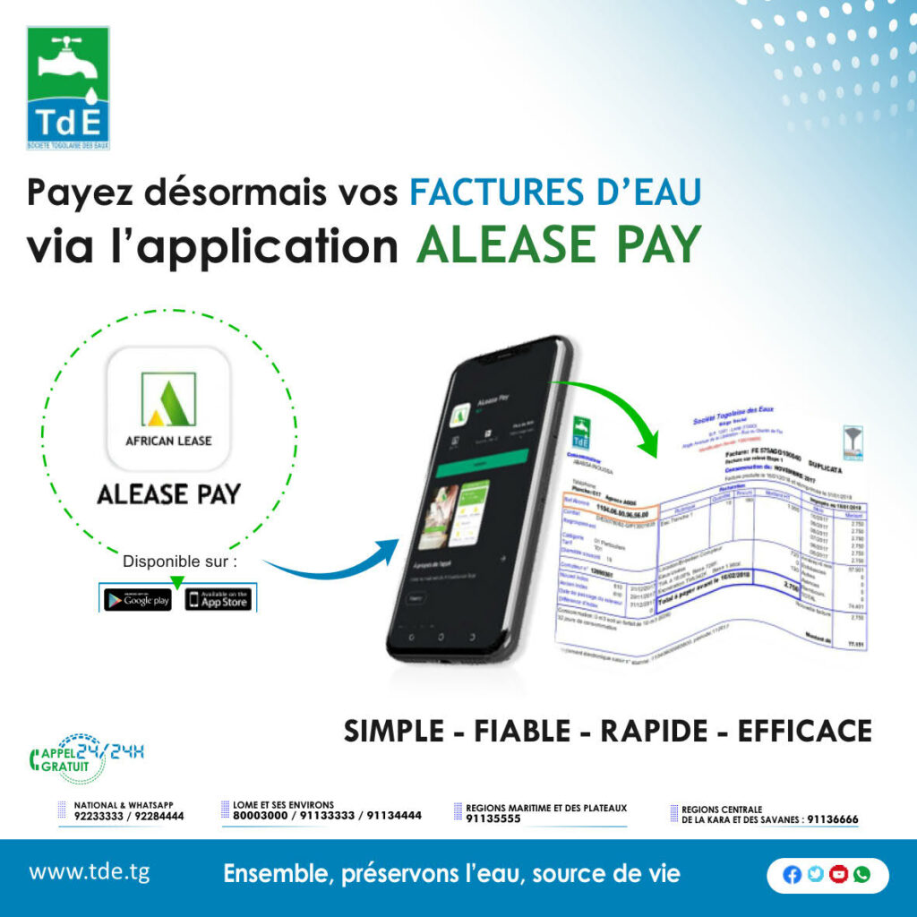 Conçu par African Lease Togo une compagnie financière de la place, ALEASE PAY est téléchargeable sur APP STORE et GOOGLE PLAY. Cette application permet aux clients de payer leurs factures d’eau depuis leurs smartphones ou leurs tablettes quel que soit leurs emplacements 24heures/24 et 7 jours sur 7