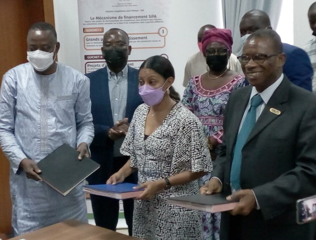 Deux instituts du Togo à savoir l’institut b des sciences technologiques, économiques et administratives (FORMATEC) et l’institut national de formation agricole (INFA) de Tové bénéficient de l’accompagnement financier de l’initiative pour le développement des compétences en Afrique (SIFA). La signature de convention s’est déroulée ce 18 mai 2022 au cabinet du ministère de l’agriculture nde l’élevage et du développement rural, en présence du directeur de cabinet du ministère de l’agriculture, du ministre de l’enseignement technique, des responsables de la banque allemande KfW, de la représente de l’agence de développement de l’Union africaine (AUDA-NEPAD) ainsi que les représentants des deux instituts bénéficiaires.