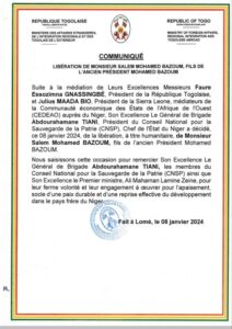 Alors que le Togo était à l’orée de cette crise pays médiateur à travers notamment sa diplomatie, le pays de Faure Gnassingbé n’a cependant pas voulu s’arroger cette bonne nouvelle. C’est dans ce contexte qu’un communiqué pondu par le ministère des affaires étrangères du Togo datant du 8 janvier 2024 a attribué cette libération à la médiation de la CEDEAO.