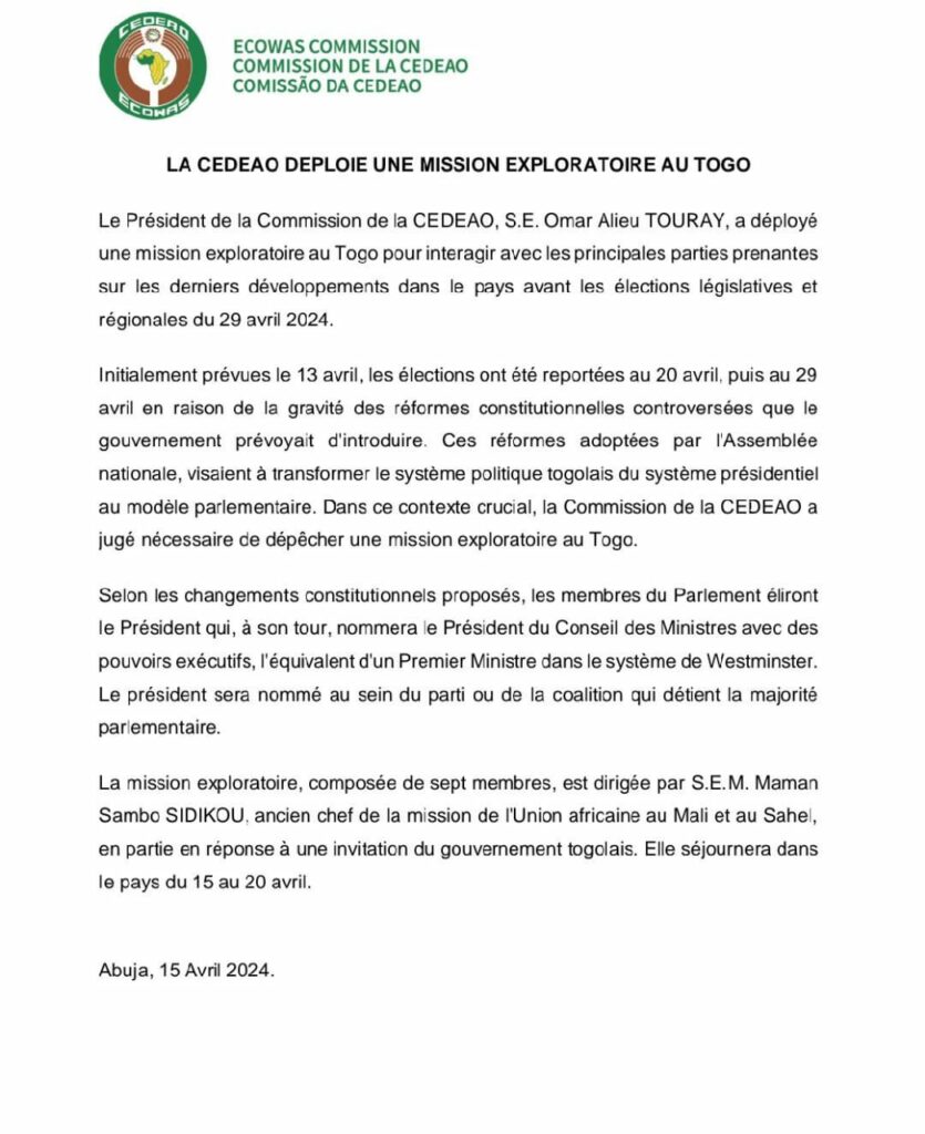 C’est par un communiqué que le Président de la Commission de la CEDEAO Omar Alieu Touray a annoncé avoir déployé une mission exploratoire au Togo ce 15 avril pour interagir avec les principales parties sur les derniers développements ( changement de la constitution et les manifestations) dans le pays avant les élections du 29 avril 2024.