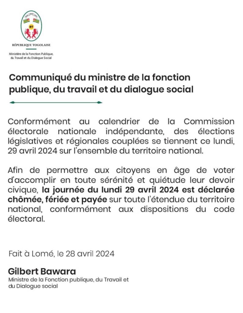 Afin de permettre aux citoyens en âge de voter d’accomplir en toute sérénité et quiétude leur devoir civique, la journée du lundi 29 avril 2024 est déclarée chômée, fériée et payée sur toute l’étendue du territoire national, conformément aux dispositions du code électoral”.