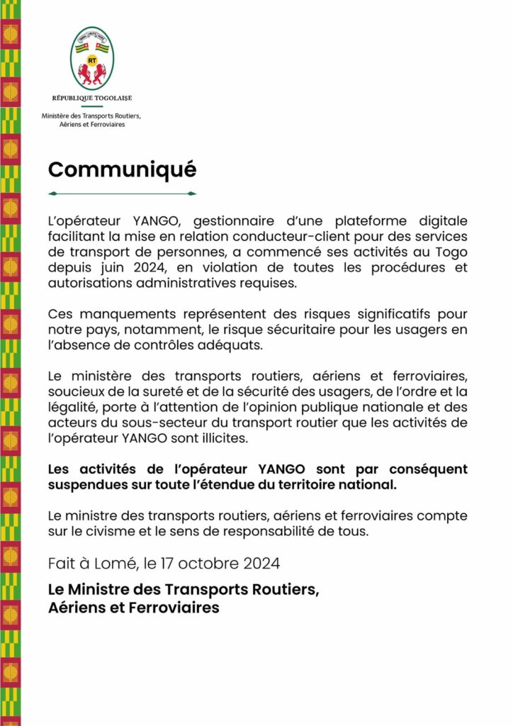 Le ministère des transports routiers, aériens et ferroviaires, soucieux de la sureté et de la sécurité des usagers, de l’ordre et la légalité, porte à l’attention de l’opinion publique nationale et des acteurs du sous-secteur du transport routier que les activités de l’opérateur YANGO sont illicites.