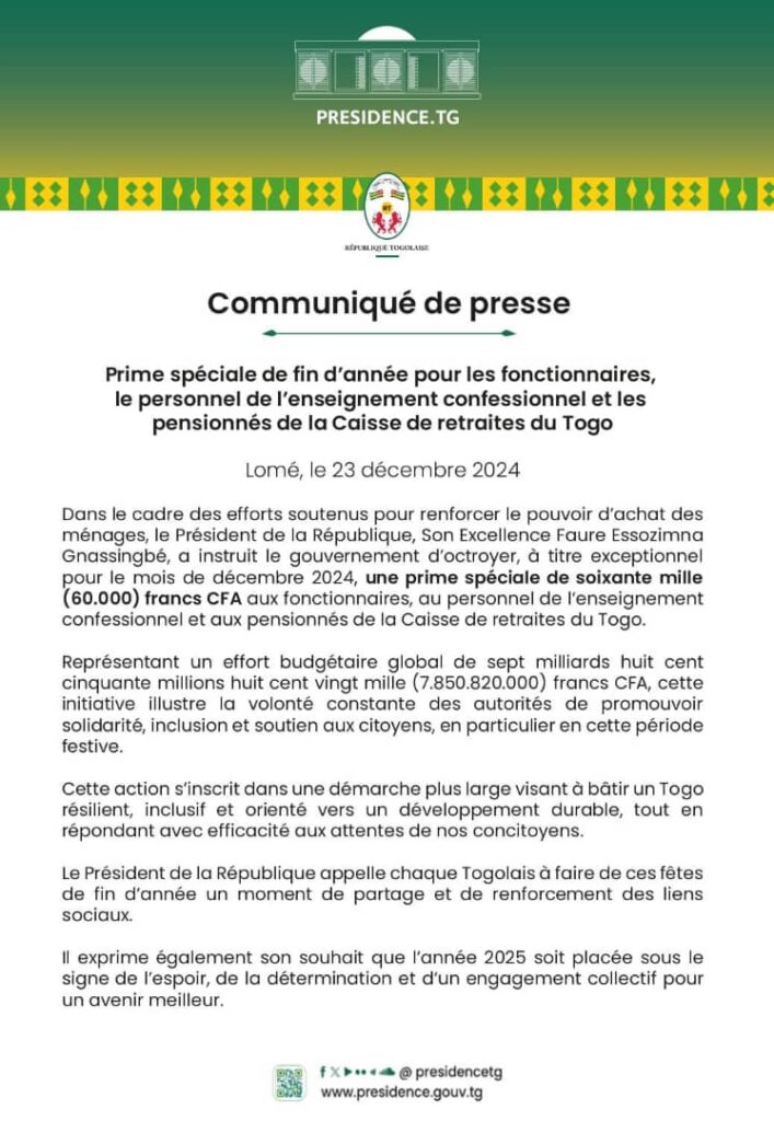 Dans le cadre des efforts soutenus pour renforcer le pouvoir d’achat des ménages, le Président de la République, Son Excellence Faure Essozimna Gnassingbé, a instruit le gouvernement d’octroyer, à titre exceptionnel pour le mois de décembre 2024, une prime spéciale de soixante mille (60.000) francs CFA aux fonctionnaires, au personnel de l’enseignement confessionnel et aux pensionnés de la Caisse de retraites du Togo.