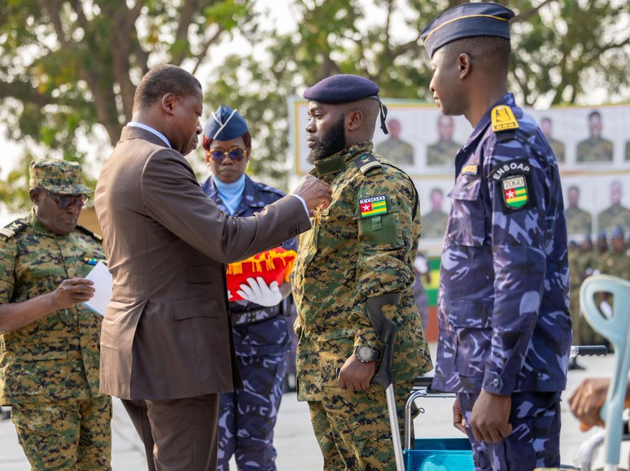 Le président a déposé des gerbes en mémoire des soldats tombés au combat dans la région des Savanes. À titre posthume, il a élevé ces héros au rang de Chevaliers de l’Ordre du Mono. Les familles ont reçu des drapeaux et des médailles pour honorer leur mémoire.