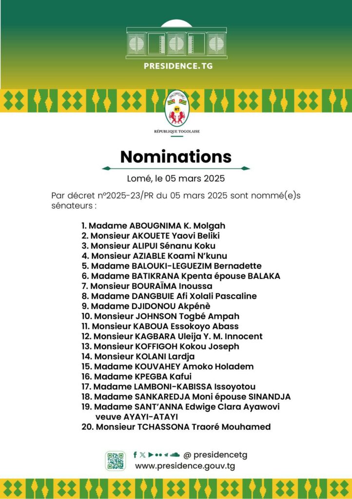 En accord avec les dispositions de la nouvelle Constitution de la Ve République du Togo, le Président de la République, Faure Gnassingbé, a procédé ce 5 mars à la nomination de 20 sénateurs. Ces personnalités, composées équitablement de 10 hommes et 10 femmes, viennent compléter les 41 sénateurs élus récemment, achevant ainsi la mise en place du Sénat.