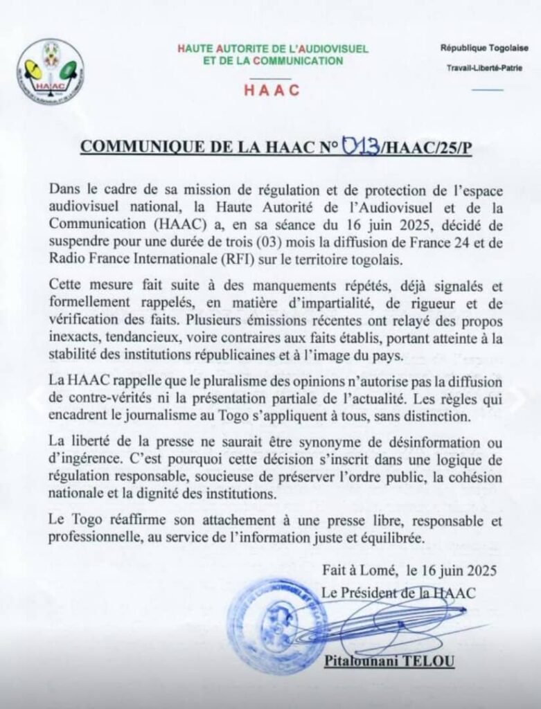 La Haute Autorité de l’Audiovisuel et de la Communication (HAAC) a annoncé ce 16 juin 2025, la suspension pour une durée de trois mois des médias internationaux France 24 et Radio France Internationale (RFI) sur l’ensemble du territoire togolais. Cette décision s’inscrit dans le cadre de sa mission de régulation et de protection de l’espace audiovisuel national.