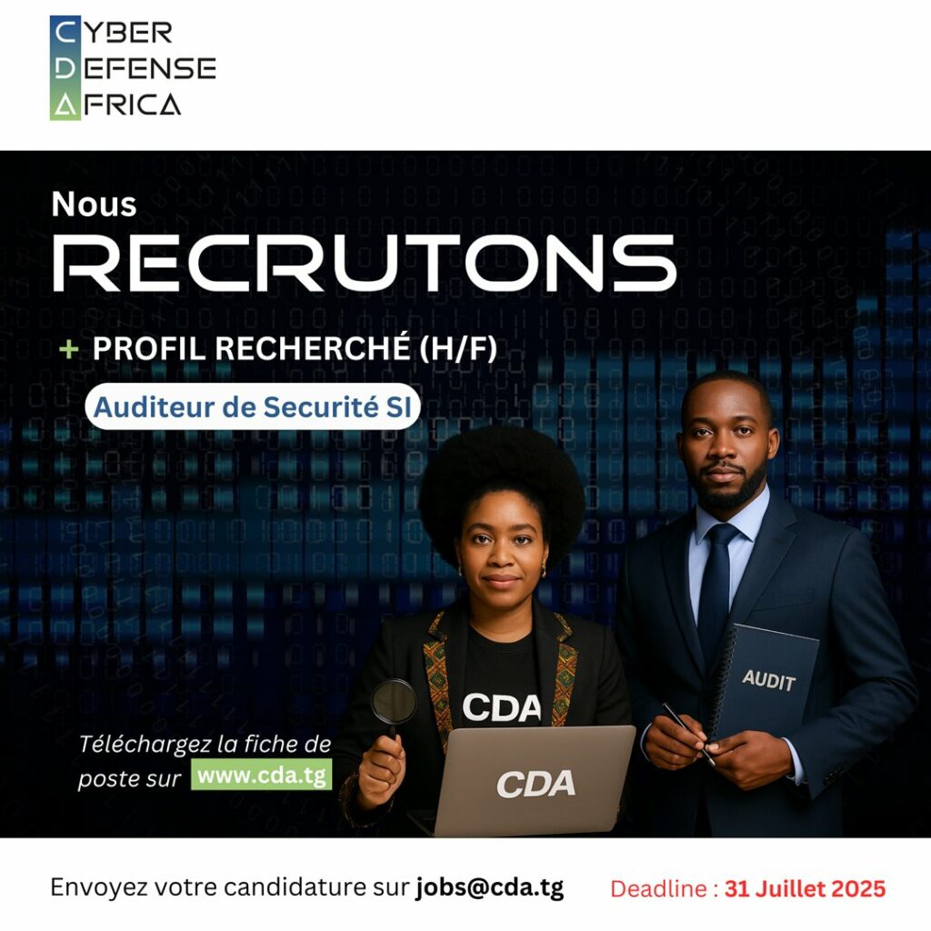 Cyber Defense Africa (CDA), en collaboration avec le ministère de l’Économie numérique, recherche un auditeur de sécurité des systèmes d’information. Cette annonce s’inscrit dans le cadre du renforcement de la cybersécurité au Togo. Les candidatures sont ouvertes jusqu’au 31 juillet 2025.