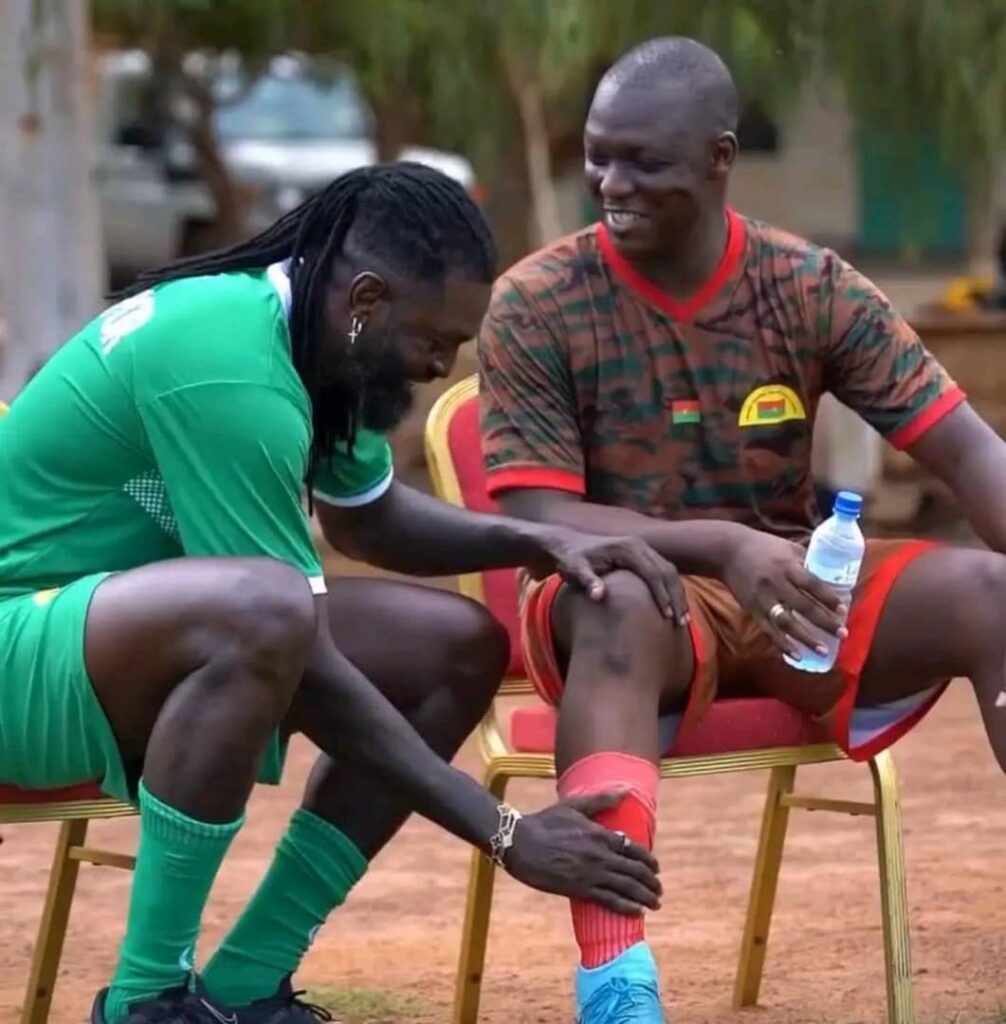 Il y a des images qui parlent plus fort que les discours. Celle d’Emmanuel Sheyi Adebayor, star du football mondial, accroupi devant le président burkinabè Ibrahim Traoré, en est une. Pas pour faire le spectacle, mais pour un simple geste, presque familial : remettre la chaussette de son hôte avec un sourire sincère. L’ancien attaquant d’Arsenal, de Manchester City ou du Real Madrid aurait pu rester dans la posture du VIP qu’il est. Mais non. Il a préféré celle de l’homme simple, de l’ami, du frère africain.